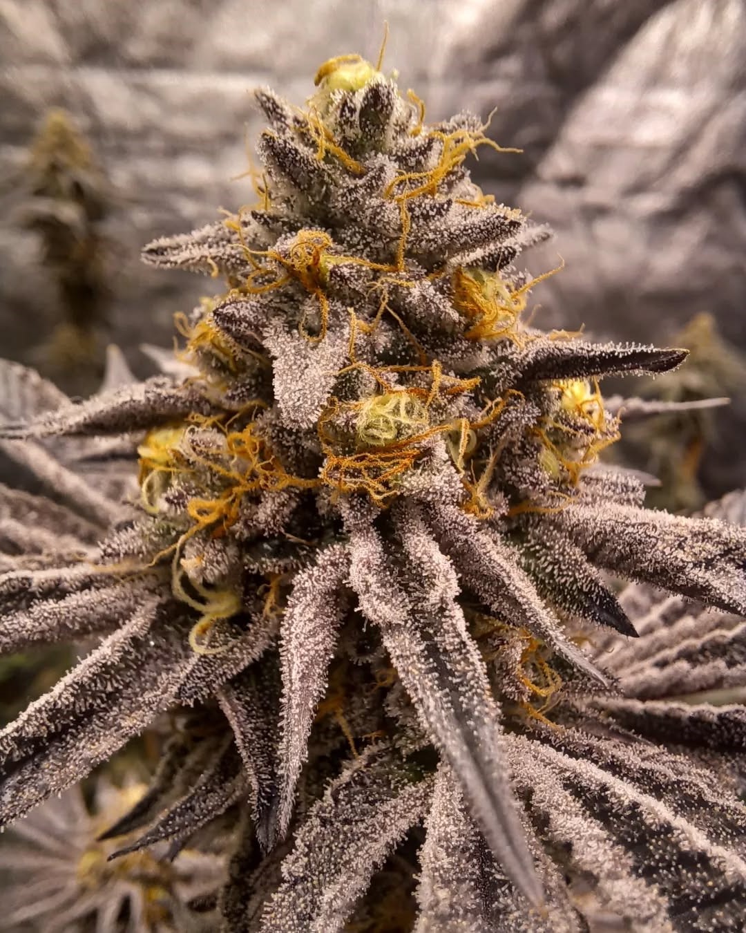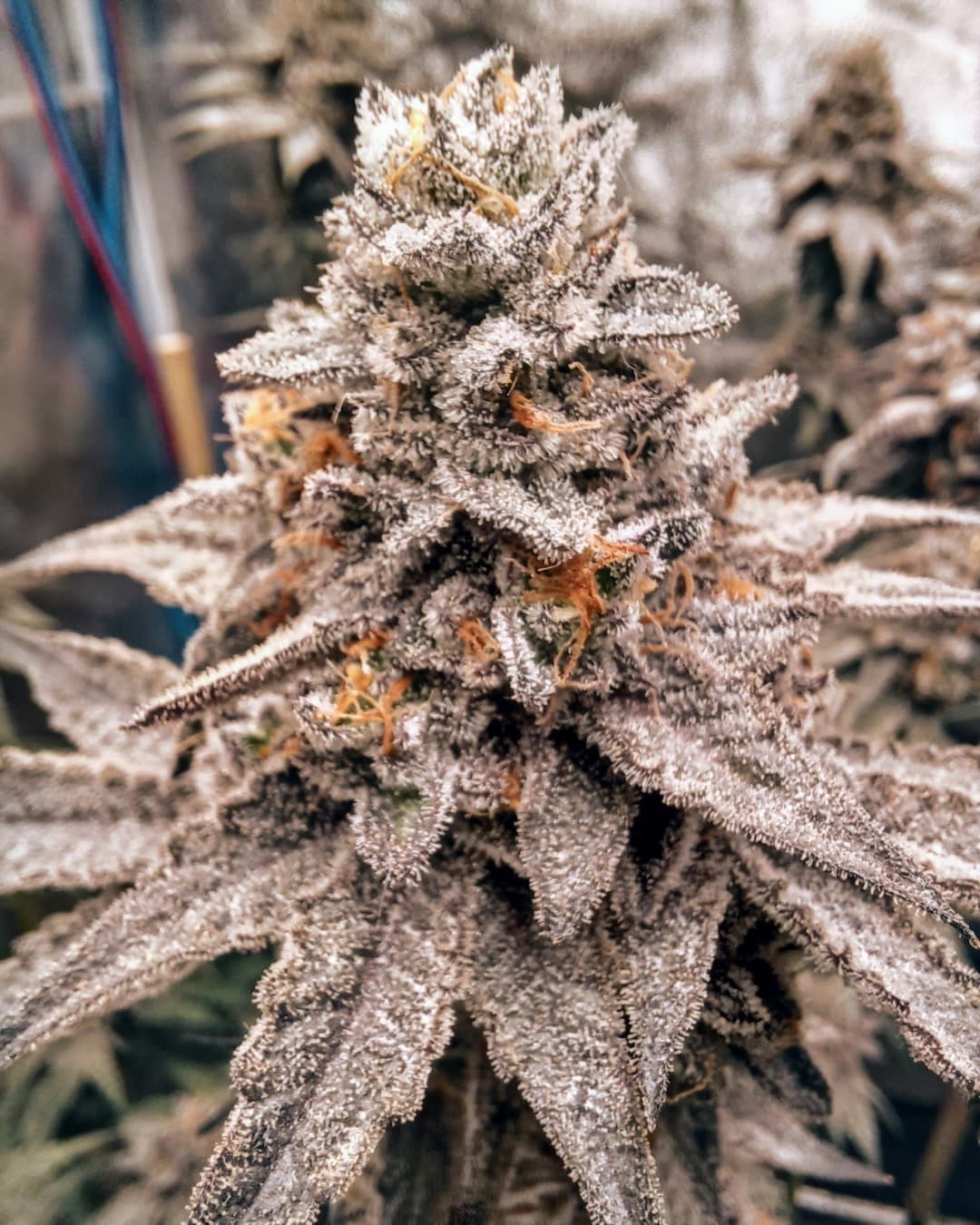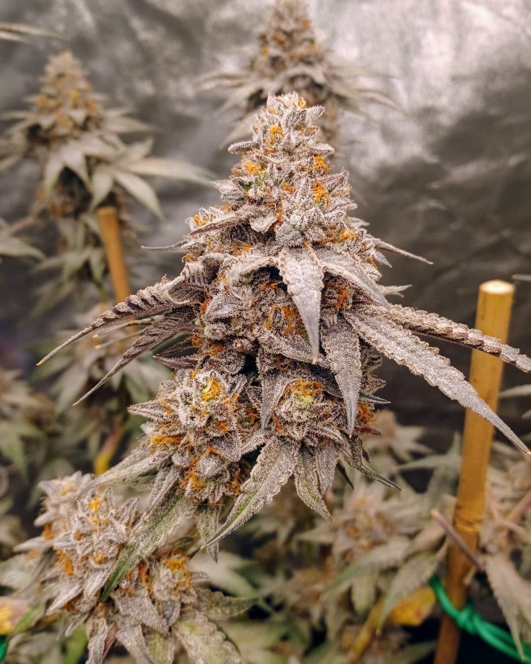 Budstruktur: Kompakt, harzreich, oft mit orangefarbenen Hairen und hellgrüner Basis